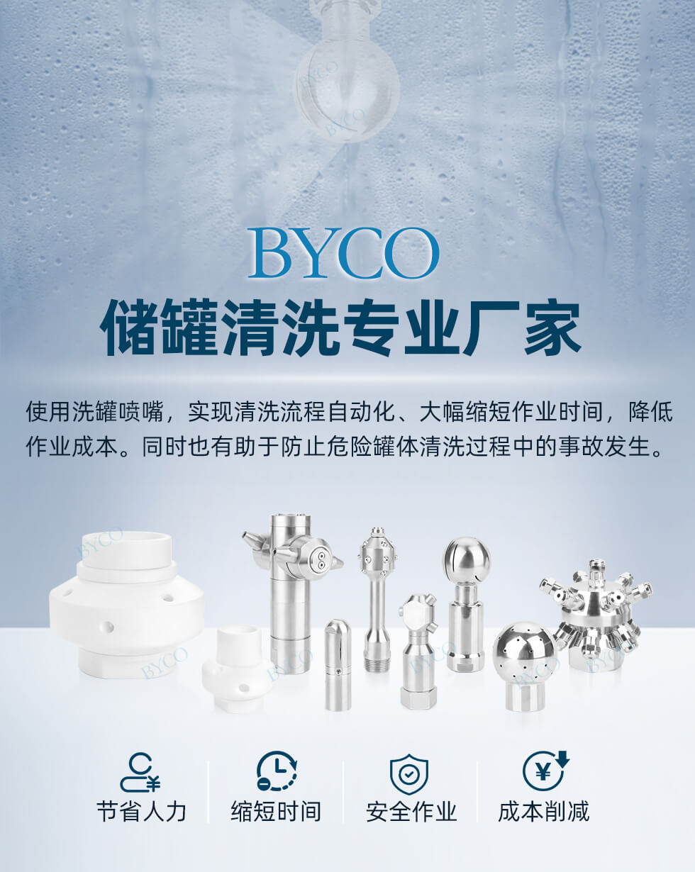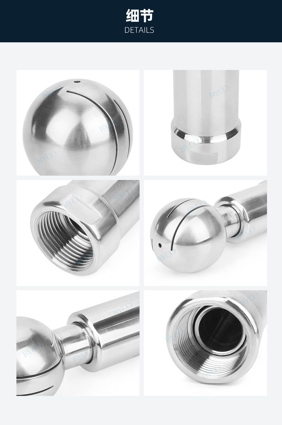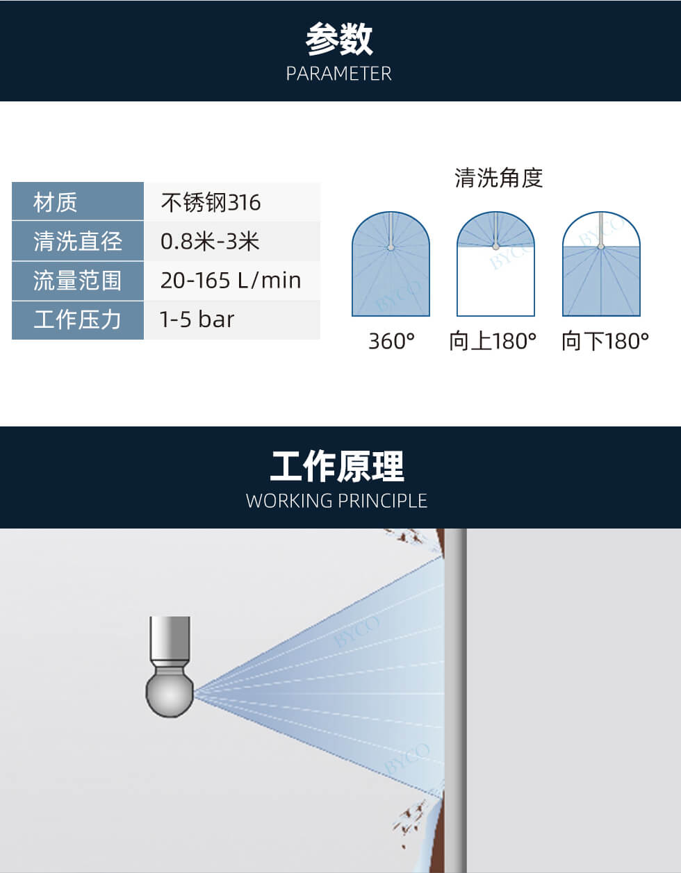 特點:固定式,用戶直徑達1.6米的槽罐,噴嘴固定,清洗或漂洗小容器的效果理想,多孔噴射,噴射的覆蓋面和形狀有多種選擇。耐用、抗腐蝕設計。