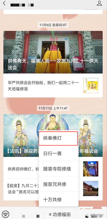 寺院捐贈系統(tǒng)中的供燈祈福模塊讓信眾通過微信公眾號、APP或觸摸屏、現(xiàn)場掃碼線上線下按天、按月、按年付費(fèi)供燈,直播查看祈福信息。